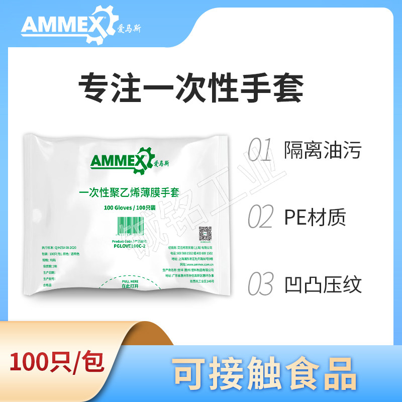 AMMEX/爱马斯 一次性PE手套 PGLOVE100C-2 均码 1.1±0.2g 无粉麻面 265±10mm 透明 100只 1袋